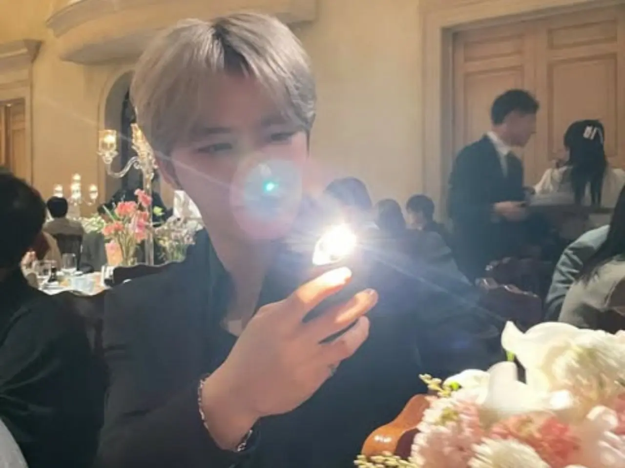 Foto tersebut menunjukkan J-JUN sedang mengambil foto buket bunga yang diterimanya.