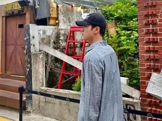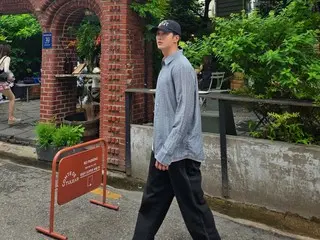 Ia mengenakan pakaian kasual berupa kemeja kotak-kotak, celana panjang hitam, dan topi, memperlihatkan esensi sebenarnya dari "foto pacar" yang hangat.