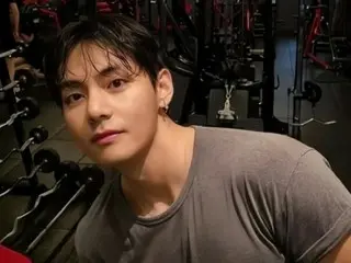 V membuat tanda perdamaian dengan rambutnya yang basah oleh keringat. Lengan dan dadanya yang berotot menarik perhatian, sementara penampilannya yang segar dan tanpa riasan juga memikat.
