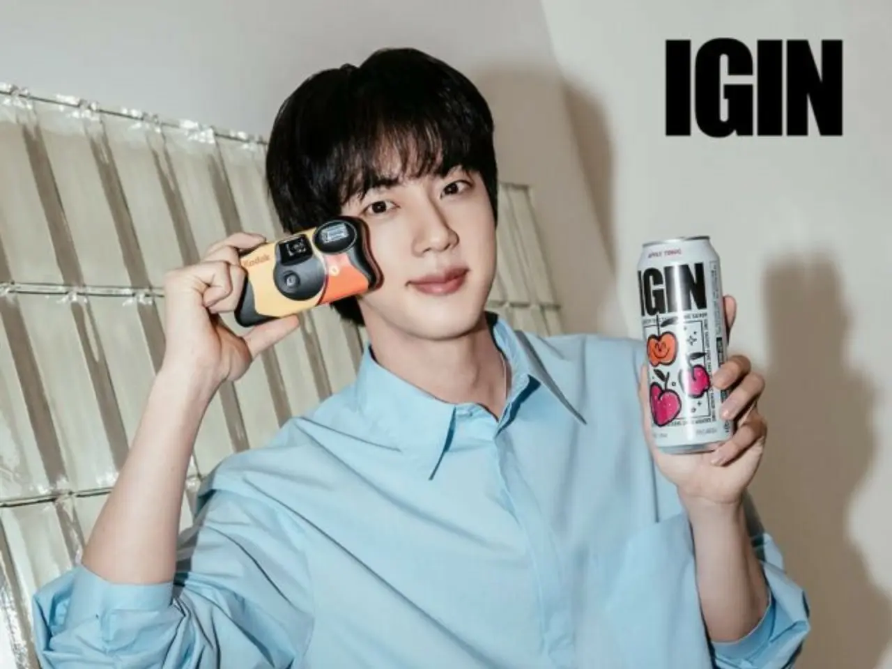 JIN tersenyum dengan IGIN di satu tangan dan kamera instan di tangan lainnya. Pesona JIN yang menyegarkan bak buah plum menarik perhatian.
