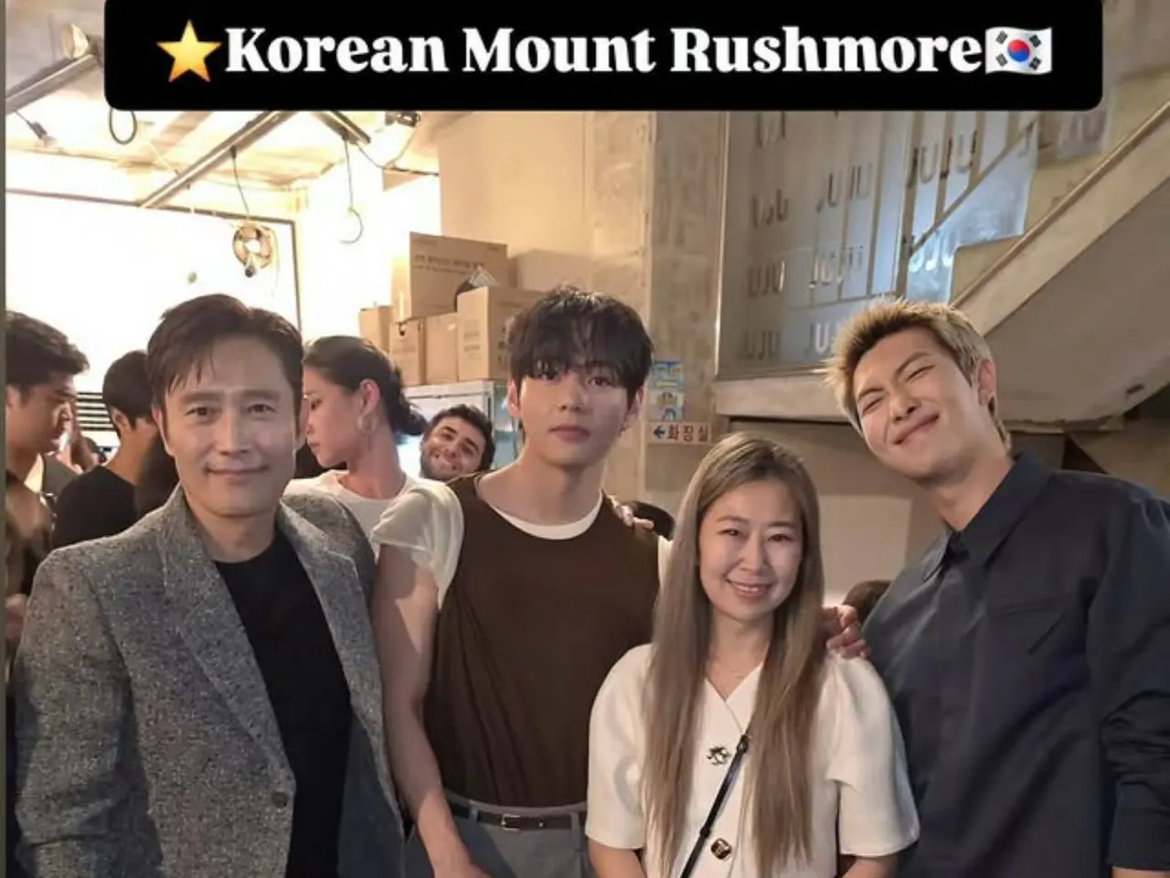 Foto yang dirilis memperlihatkan sutradara Maggie Kang bersama Lee Byung Hun, V BTS, dan RM.
