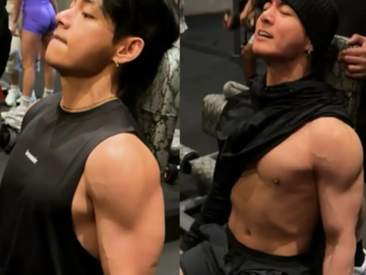 Mereka tampak sedang mengobrol. JUNG KOOK menggulung satu lengannya dan mengangkat dumbel, memamerkan otot lengannya yang kencang.