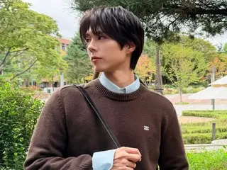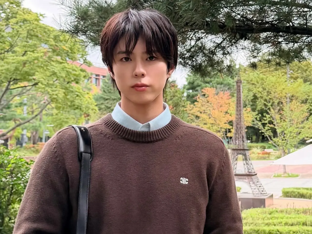 Park BoGum memiliki rambut sedikit lebih panjang dan atasan rajutan berlapis di atas kemejanya, menciptakan tampilan yang menyegarkan dan bernuansa musim gugur.